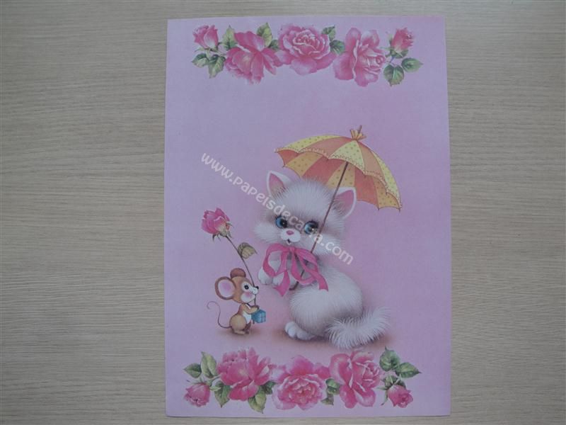 Papel de carta grande antigo com uma gatinha segurando uma sombrinha e conversando com uma ratinha que está segurando uma rosa.