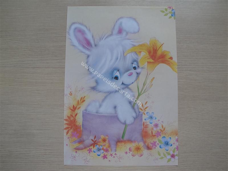 Papel de carta grande antigo um coelhinho dentro de um tronco de árvore segurando uma flor.