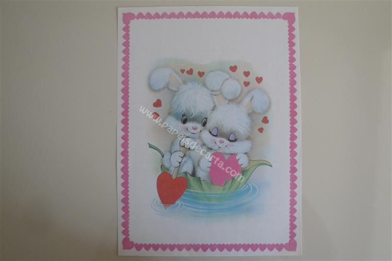 Papel de carta grande, antigo, com borda de corações rosas e um casal de coelhinhos navegando em um rio.