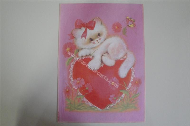 Papel de carta grande, antigo, com uma gatinha deitada sob um coração.