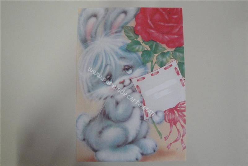 Papel de carta grande, antigo, com um coelhinho segurando uma rosa e um envelope.