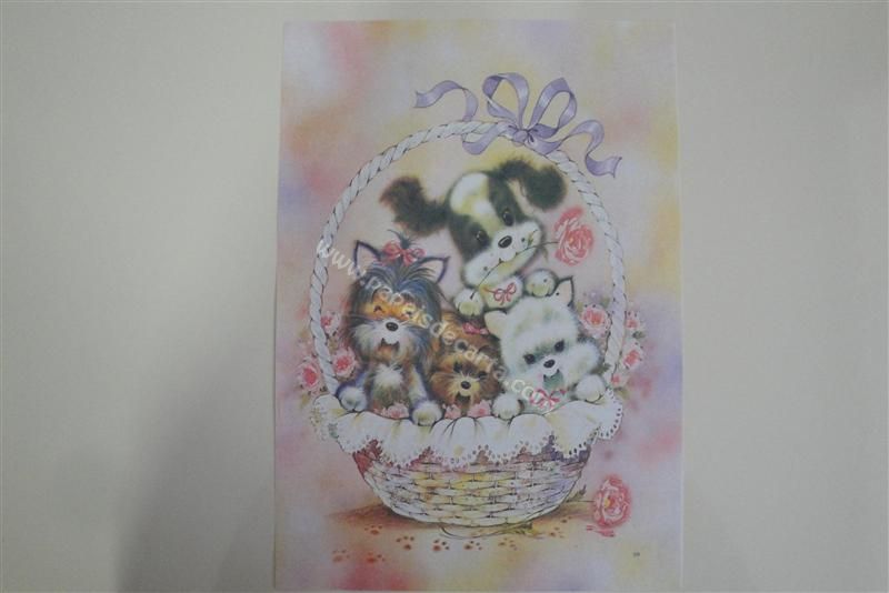Papel de carta grande, antigo, com uma cesta cheia de filhotes de cachorros.