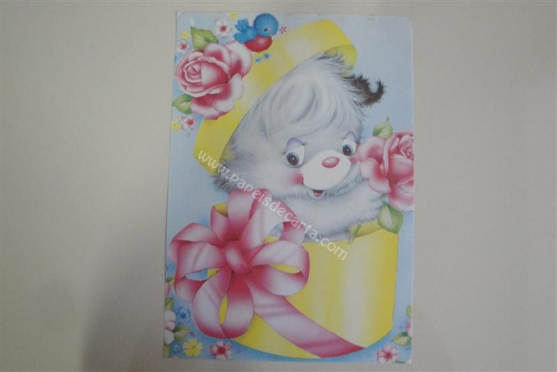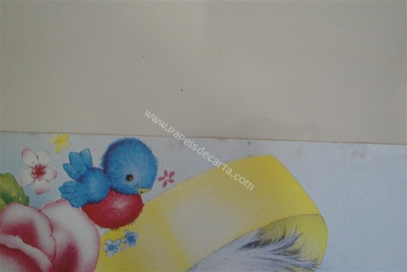 Papel de carta grande, antigo, com uma cachorrinha(?) segurando uma rosa dentro de uma caixa de presentes amarela. Obs: Papel um pouco manchado.