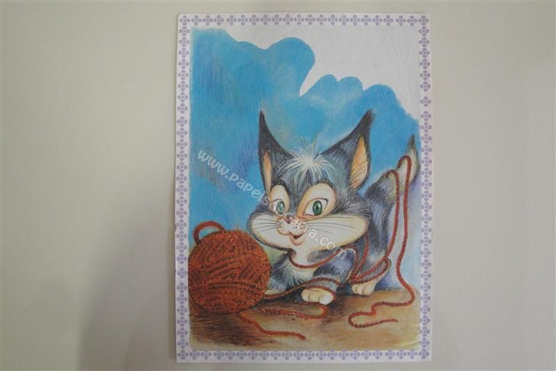 Papel de carta grande, antigo, com um gatinho brincando com o novelo de lã.
