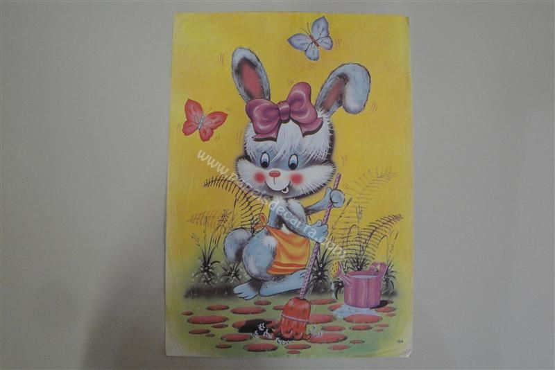 Papel de carta grande, antigo, com uma coelha varrendo seu jardim. Obs: Apesar de não ter a identificação da coleção, o papel têm o número 164.