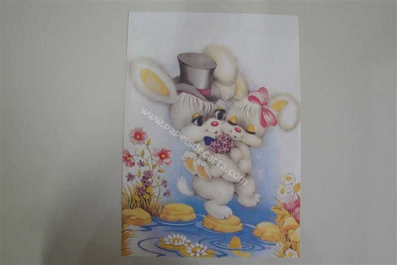 Papel de carta grande, antigo, com um coelhinho segurando sua namorada no colo e atravessando o rio pelas pedras da superfície. Obs: Apesar de não ter a identificação da coleção, o papel têm o número 74.
