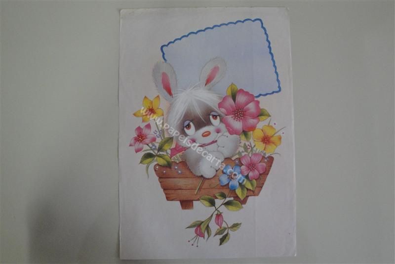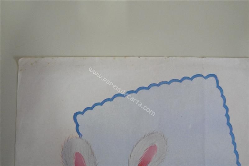 Papel de carta grande, antigo, com uma coelhinha segurando uma flôr dentro de uma jardineira.