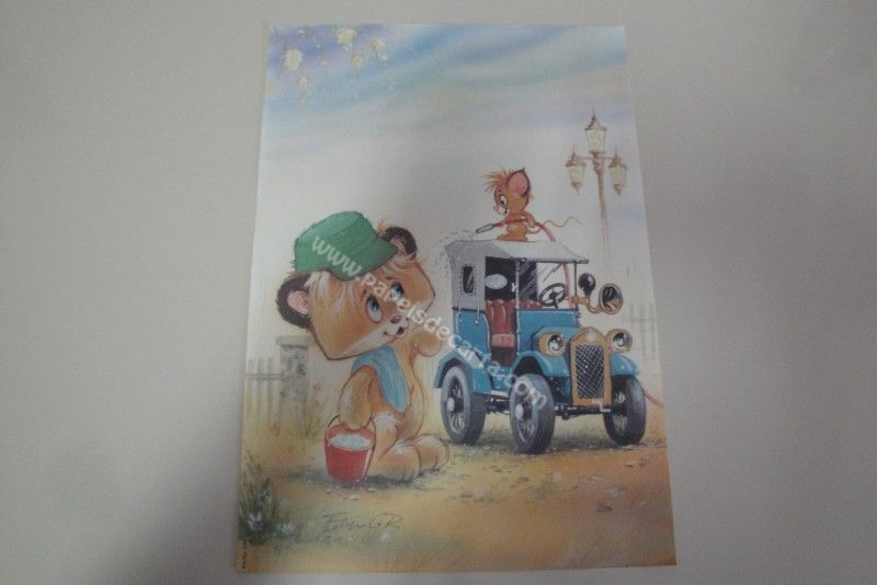 Papel de carta grande, antigo, com um ursinho e um ratinho lavando o carro. Coleção: Meta Print. Número : 003.