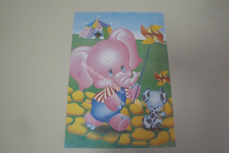 Papel de carta grande, antigo, com um elefante e um cachorrinho passeando em frente ao circo com um catavento. Coleção: Coleções 96 Número: 17 Obs: Assinado por Robson Tuzi