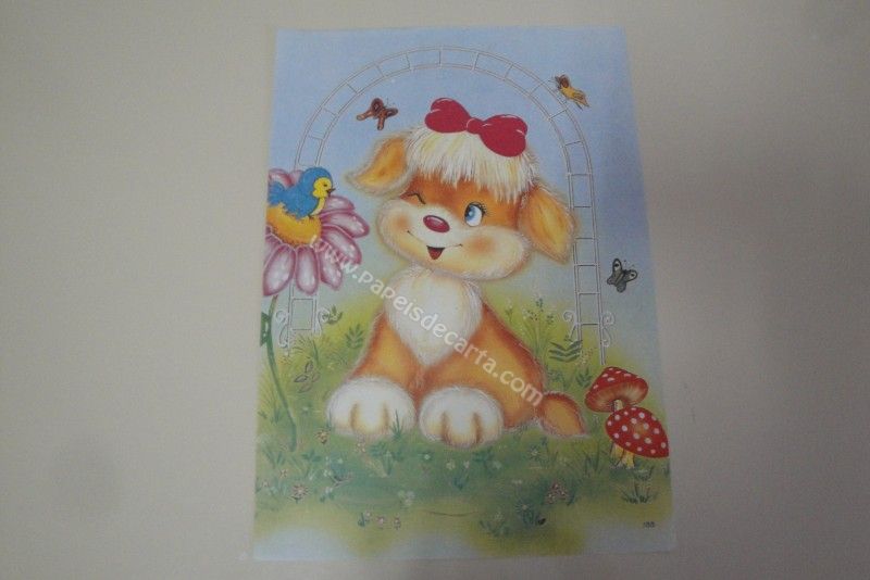 Papel de carta antigo, de tamanho grande (A4), com uma cachorrinha sentada abaixo de um arco e um jardim. Coleção: - Número: 155