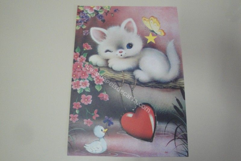 Papel de carta antigo, de tamanho grande (A4), de coleção não identificada, com um gatinho deitado em um tronco acima de um rio. Coleção: - Número: 04