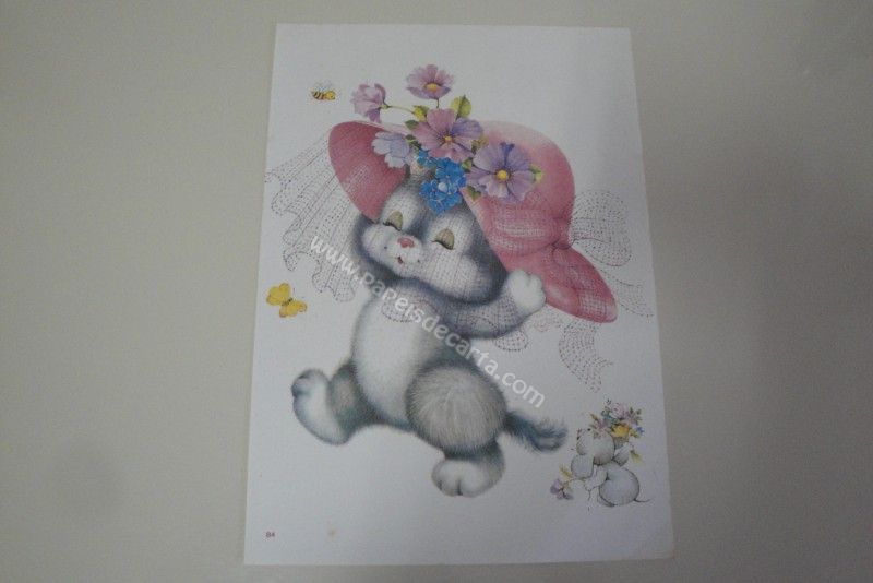 Papel de carta antigo, de tamanho grande (A4), de coleção não identificada, com uma gatinha passeando com um chapéu de flores. Coleção: - Número: 84