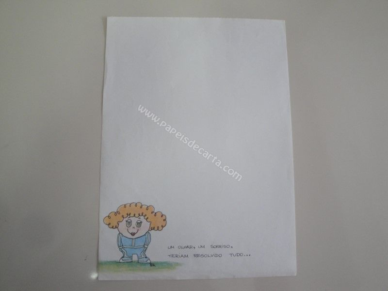 Papel de carta antigo com 1 folha tamanho médio. Possui a frase: Um olhar, um sorriso, teriam resolvido tudo...