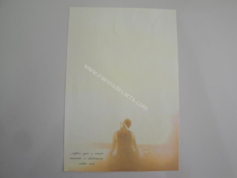 Papel de carta antigo com 1 folha tamanho médio. Possui a frase: ...espero que o amor encurte a distância entre nós.