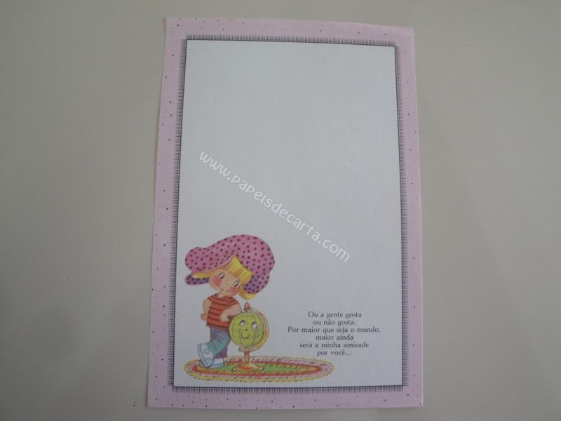 Papel de carta antigo com 1 folha tamanho médio. Possui a frase: Ou a gnete gosta ou não gosta. Por maior que seja o mundo, maior ainda será a minha amizade por você...