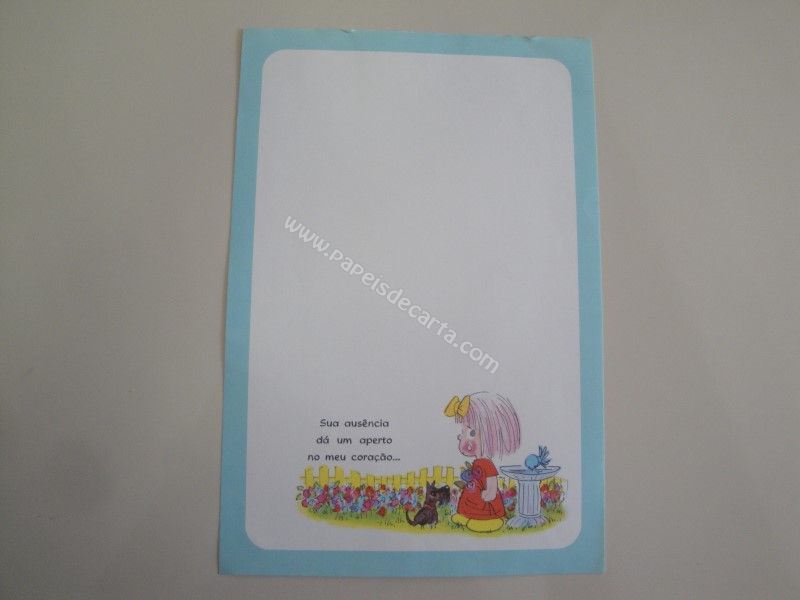 Papel de carta antigo com 1 folha tamanho médio. Possui a frase: Sua ausência dá um aperto no meu coração...