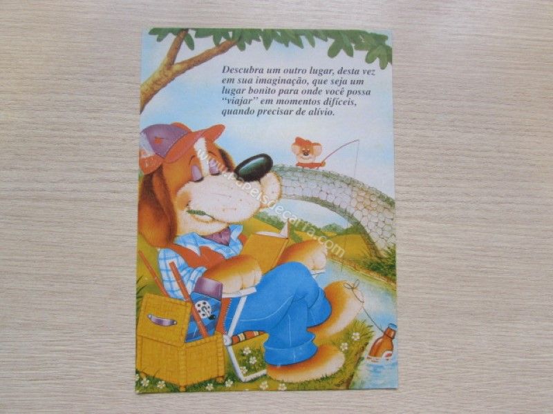 Papel de carta antigo, tamanho médio, de coleção não identificada. Frase: Descubra um outro lugar, desta vez em sua imaginação, que seja um lugar bonito para onde você possa "viajar" em momentos difíceis, quanto precisar de alívio.