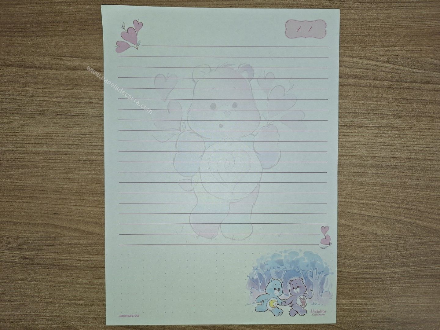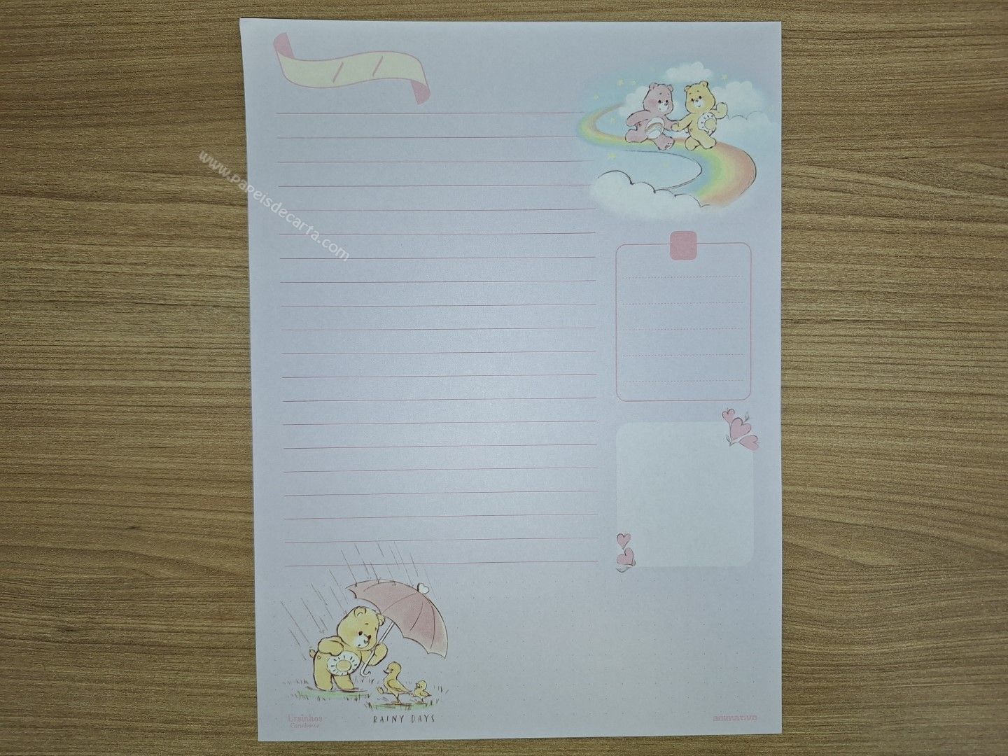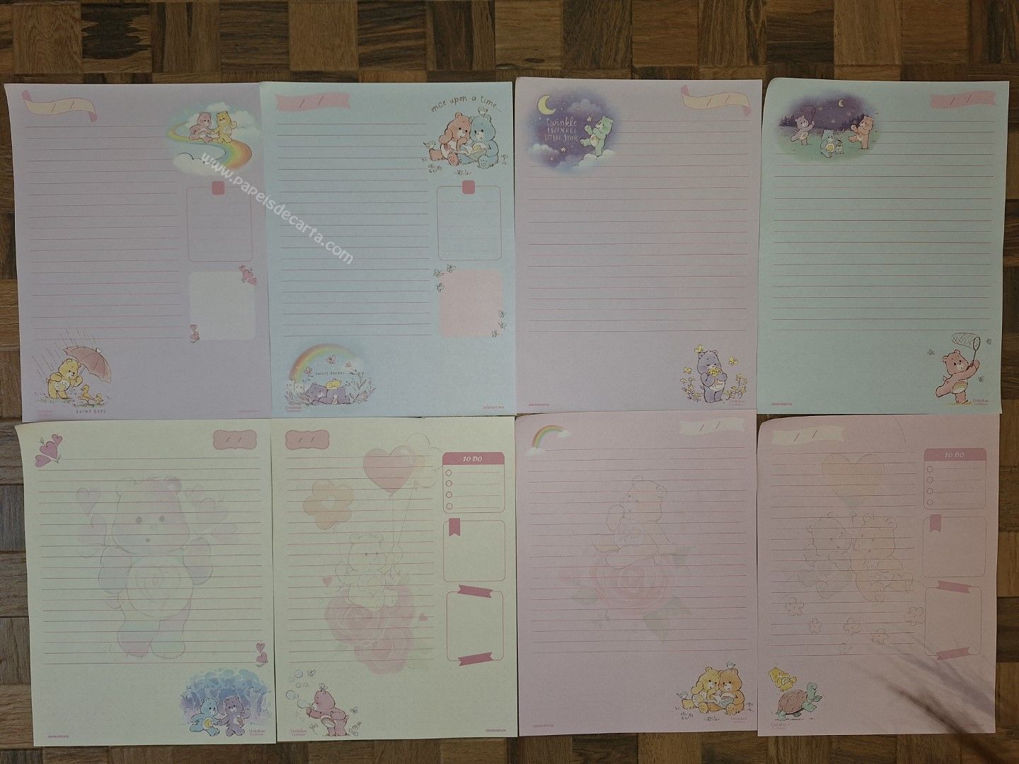Lote de papel de carta dos Ursinhos Carinhosos (Care Bears) com 8 folhas diferentes, tamanho um pouco maior que o médio.