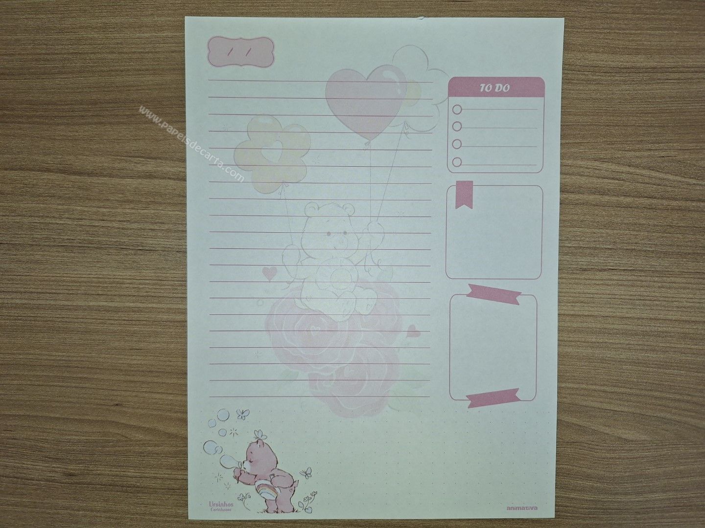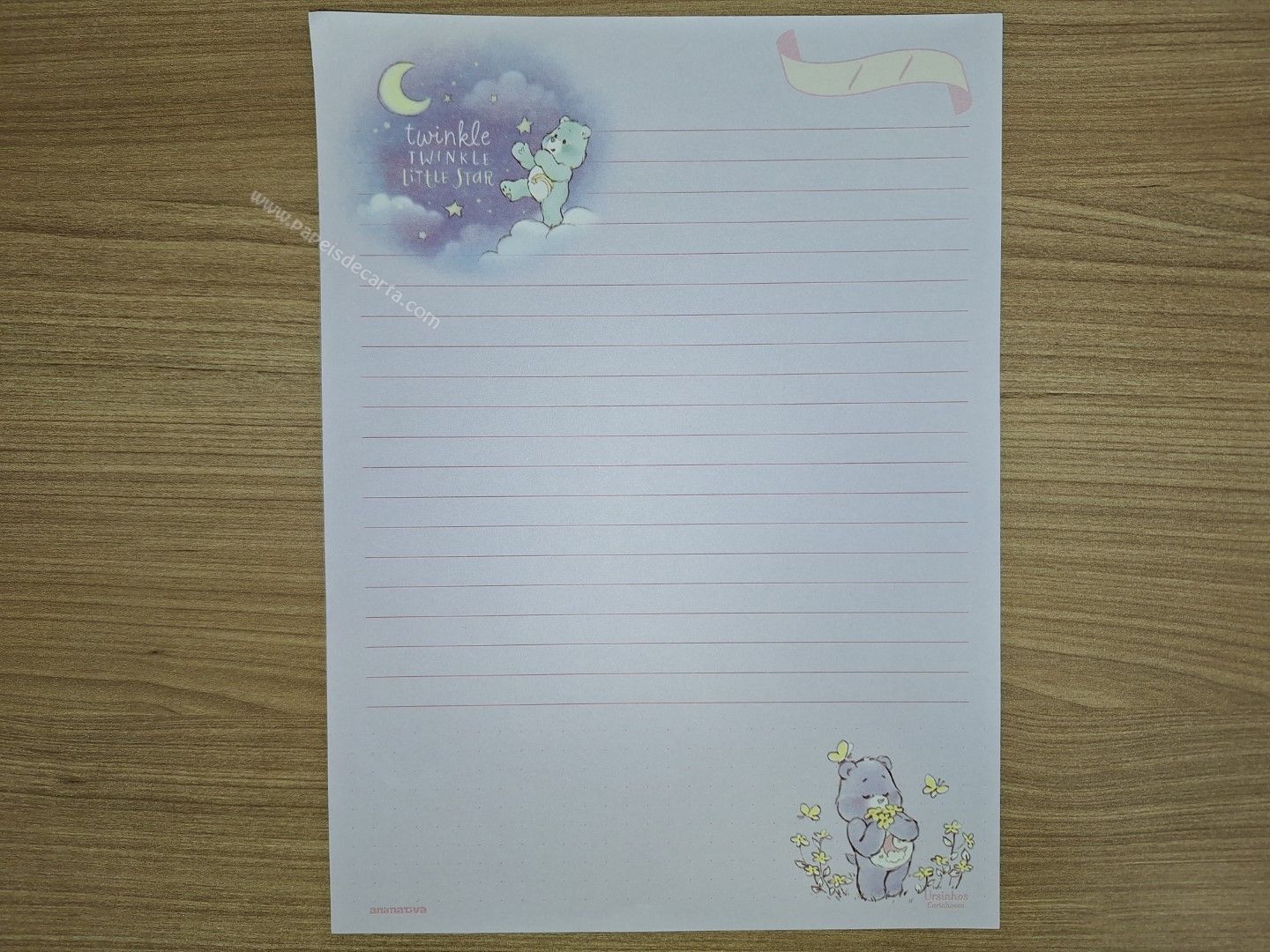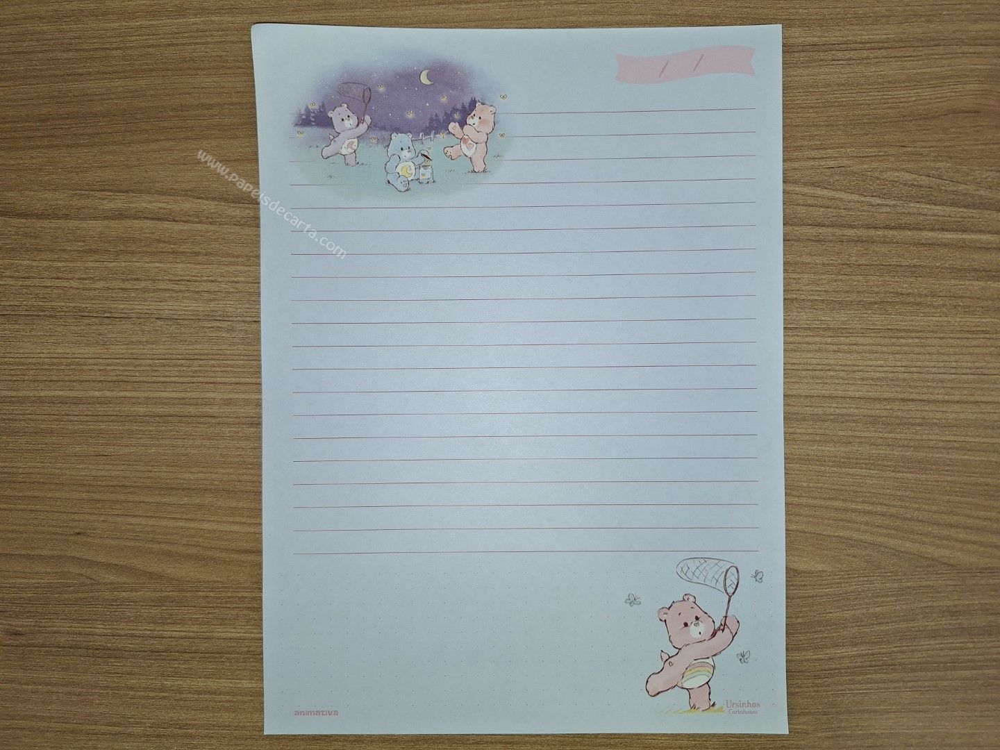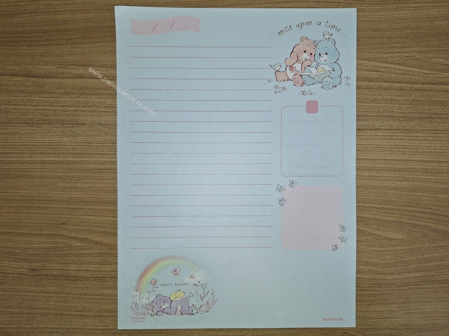 Lote de papel de carta dos Ursinhos Carinhosos (Care Bears) com 8 folhas diferentes, tamanho um pouco maior que o médio.