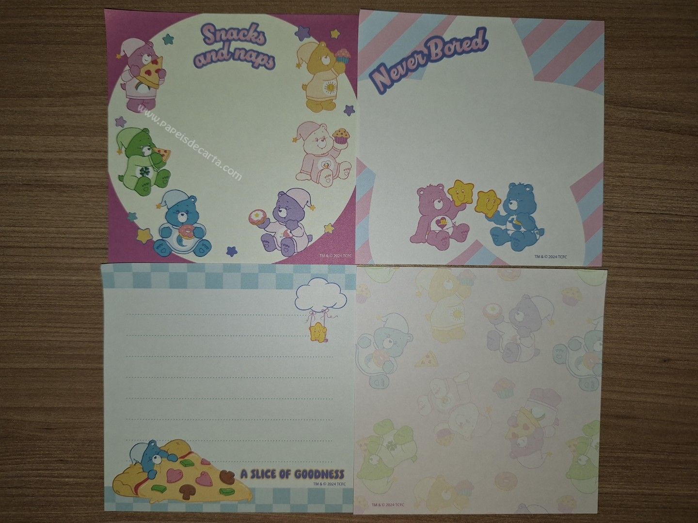 Conjunto de papel de carta dos Ursinhos Carinhosos (care bears) com 4 folhas pequenas diferentes. Tamanho das folhas: Larg: 9,5cm X alt: 9,5cm.