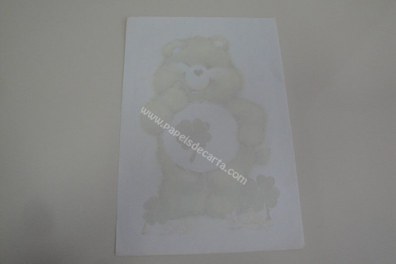 Papel de carta antigo, raro, tamanho um pouco maior que o médio do Care Bears (Ursinhos Carinhosos), com um ursinho verde do trevo da sorte.