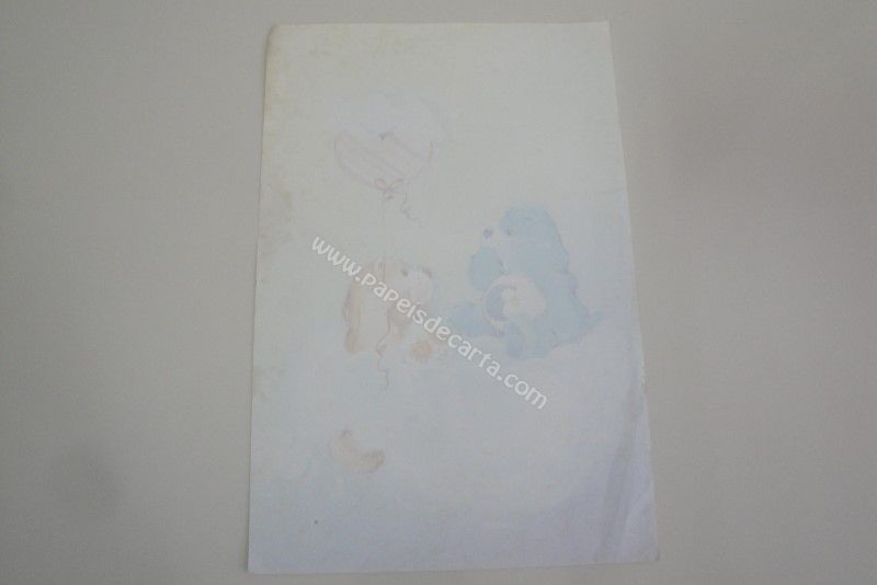 Papel de carta antigo, raro, tamanho um pouco maior que o médio do Care Bears (Ursinhos Carinhosos), com o ursinho azul da lua e o ursinho amarelo das flores. Obs: O papel está um pouco manchado e possui um pequeno furo.