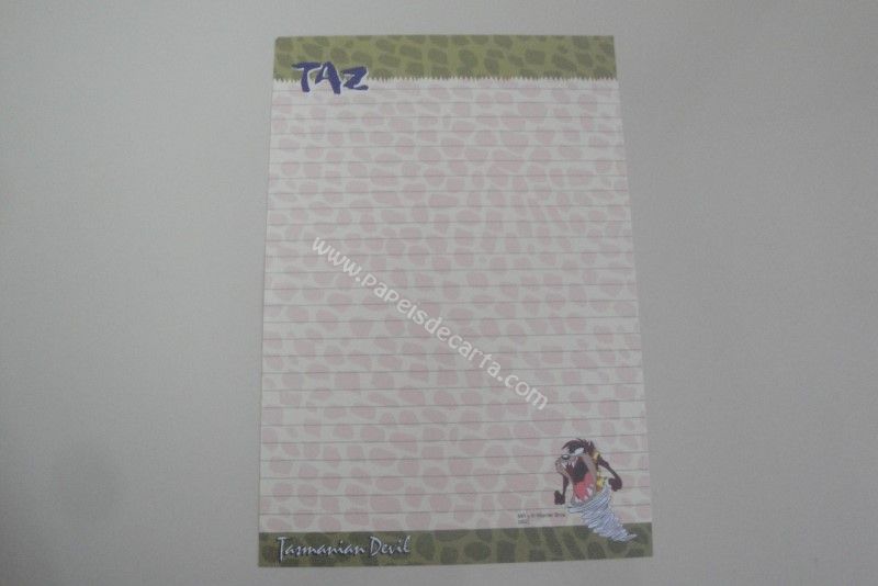 Papel de carta antigo, dos Looney Tunes, sem número, com o personagem Tasmanian Devil (Taz) em um papel estampado com linhas para escrita.