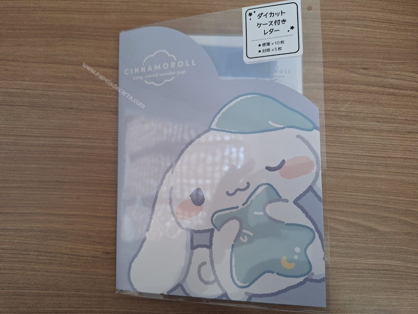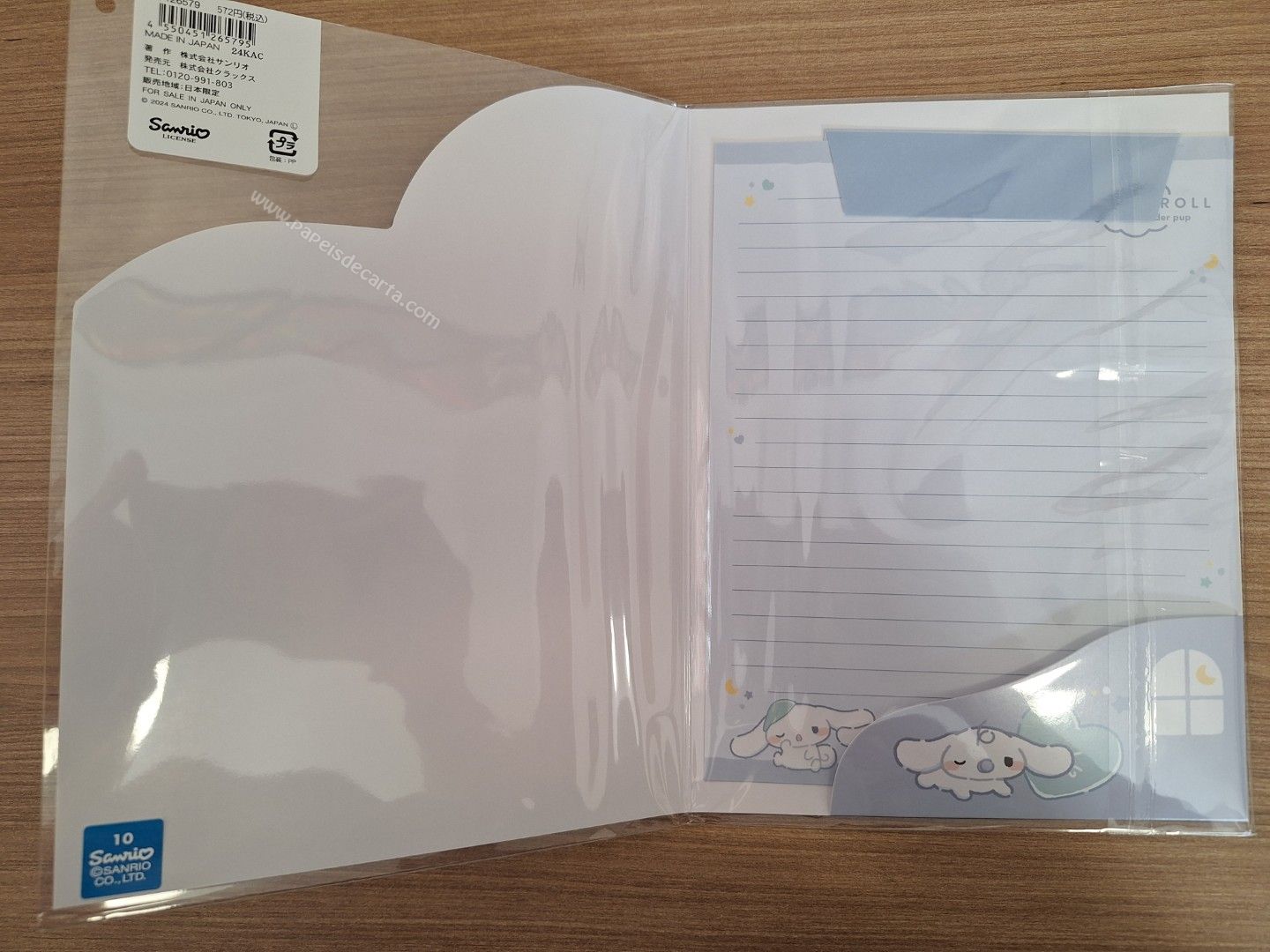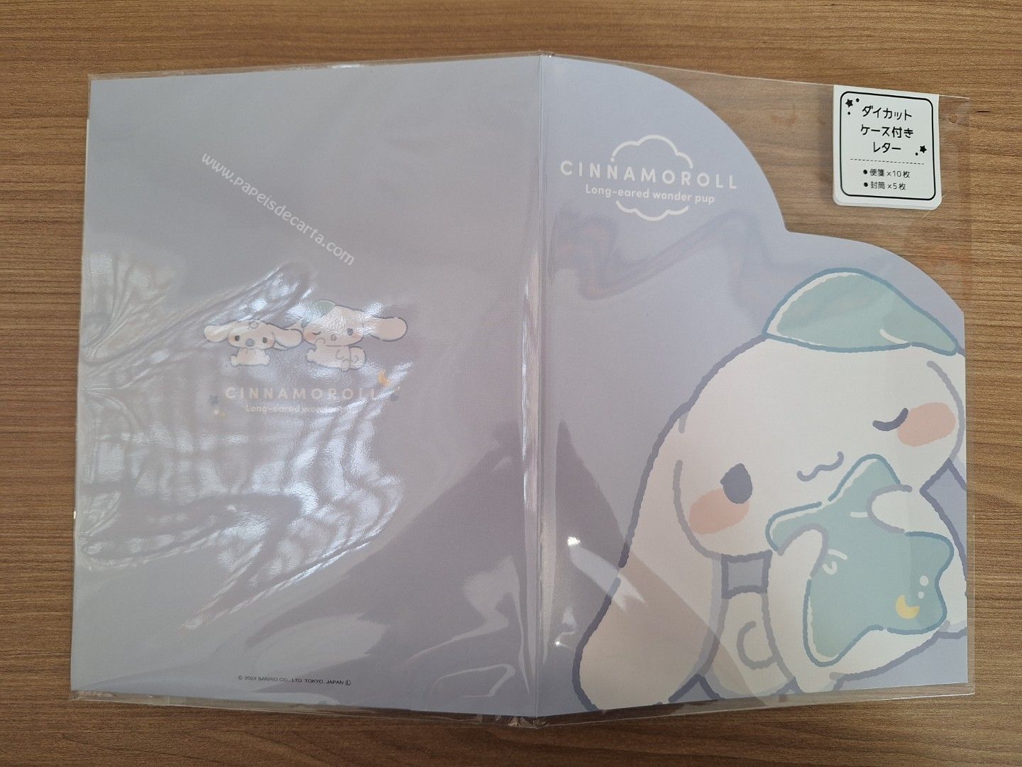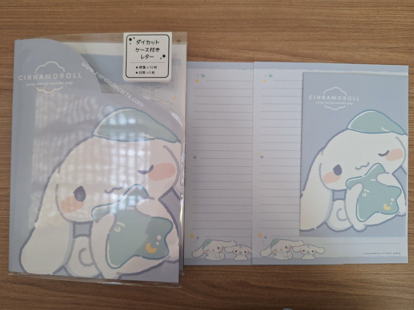 Conjunto de papel de carta importado, com 2 folhas e 1 envelope, e 1 pastinha de papelão do Cinnamoroll, da Sanrio.