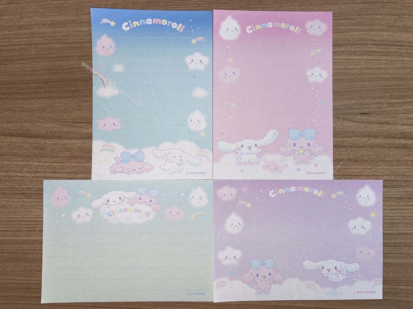 Conjunto de papel de carta com 4 papéis pequenos diferentes importados do Cinnamoroll. Tamanho: larg: 7,5cm X alt: 10,5cm.
