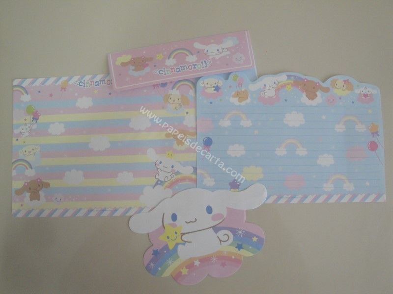 Conjunto importado, de papel de carta do Cinnamoroll, com 2 folhas diferentes, 1 notinha e 1 envelope, da Sanrio.