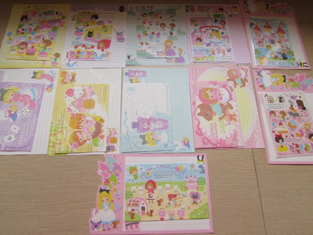 Lote com 11 conjuntos de papel de carta importado, sendo 2 folhas iguais e 1 envelope cada conjunto. COLEÇÃO FAIRY TALE WORLD LETTER. O lote contém os adesivos.