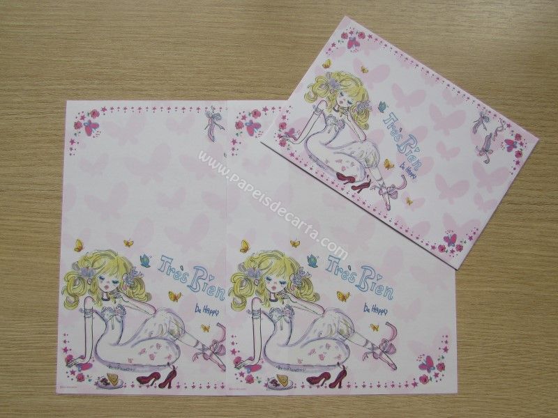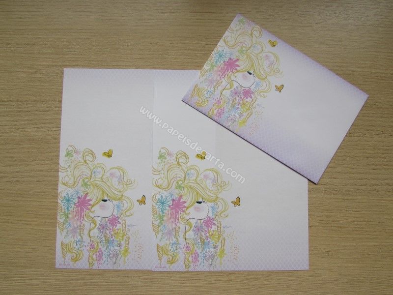 Lote promocional com 4 conjuntos de papel de carta importado, da coleção Ado Mizumori. Cada conjunto possui 2 folhas iguais e 1 envelope.