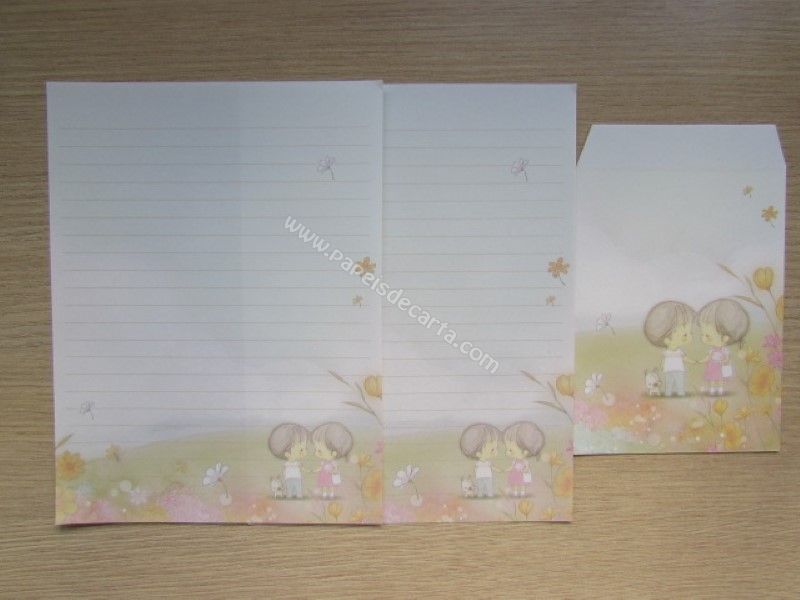 Lote promocional com 4 conjuntos de papel de carta da Amy & Tim + adesivos! Cada conjunto é formado por duas folhas iguais, um envelope e seis pequenos adesivos. TOTAL: 8 folhas, 4 envelopes e 24 adesivos.