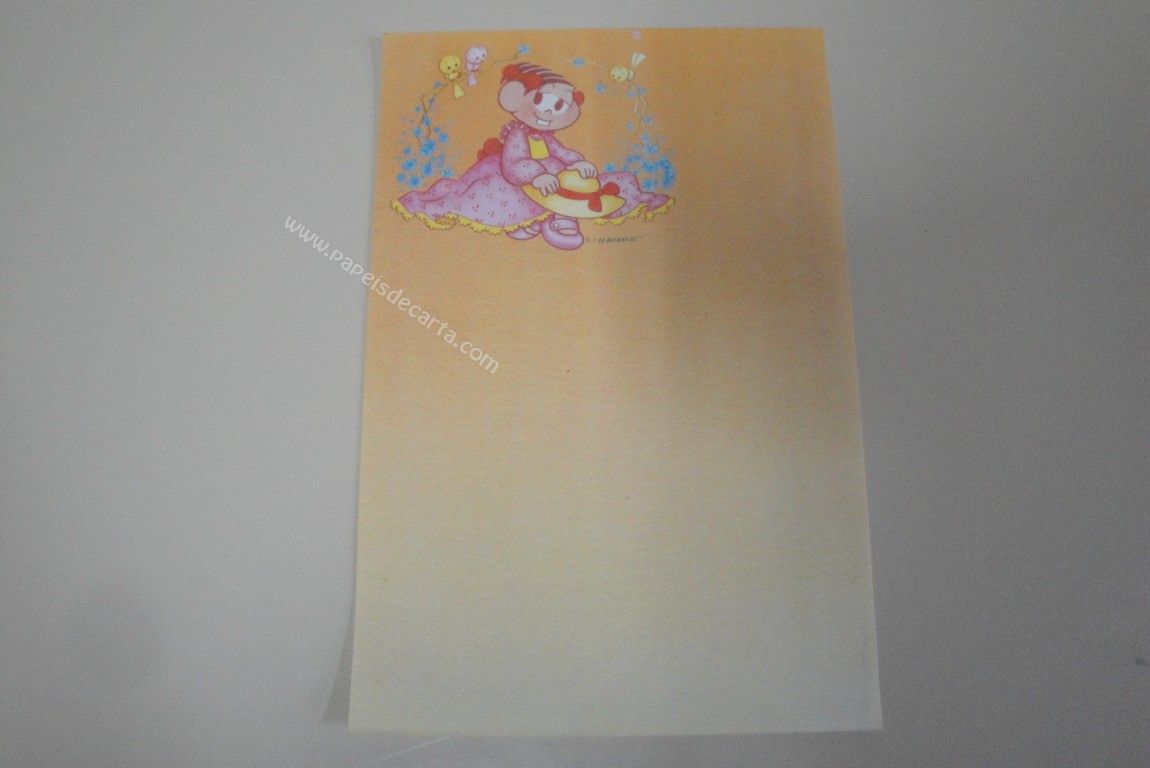 Papel de carta antigo, modelo raro, da coleção Turma da Mônica, com a Mônica rodeada de passarinhos.
