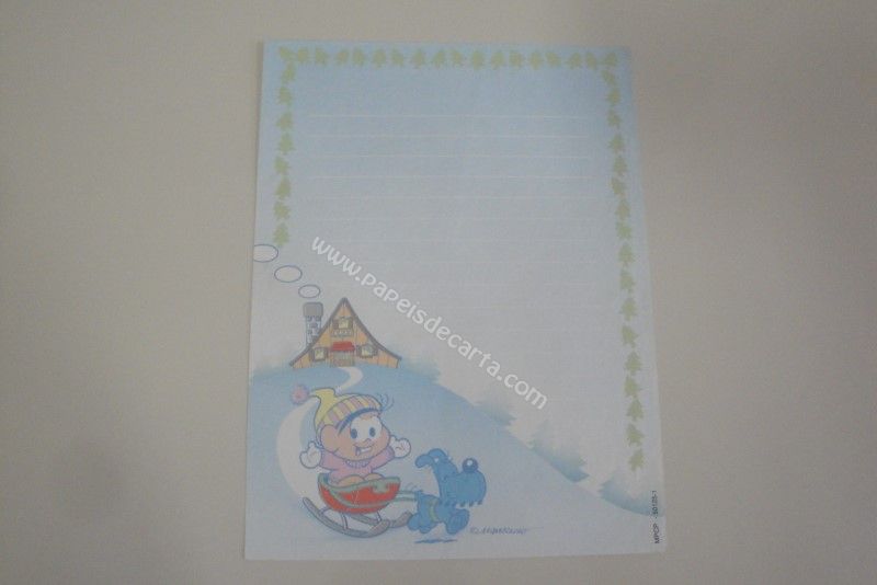 Papel de carta antigo, da coleção Turma da Mônica, número MPCP 50125-1, com a Mônica andando de trenó com o Bidu.