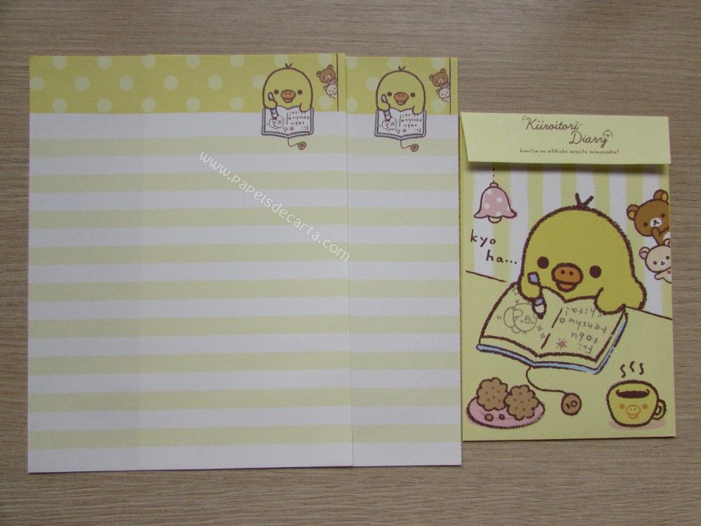 Lote do Kiiroitori Diary, San-X, sendo 6 conjuntos médios com 2 folhas iguais e 1 envelope cada conjunto. Fabricante: San-X
