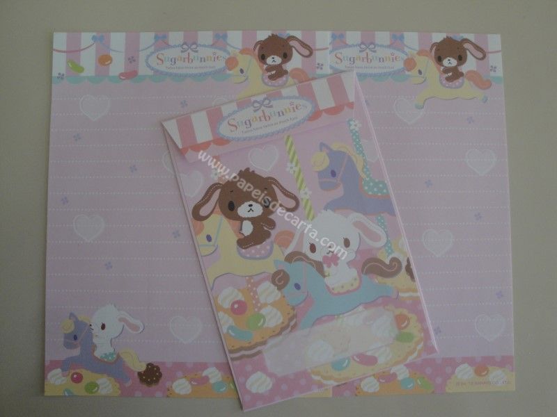 Conjunto importado de papel de carta, com 2 folhas iguais e 1 envelope do Sugarbunnies, da Sanrio.