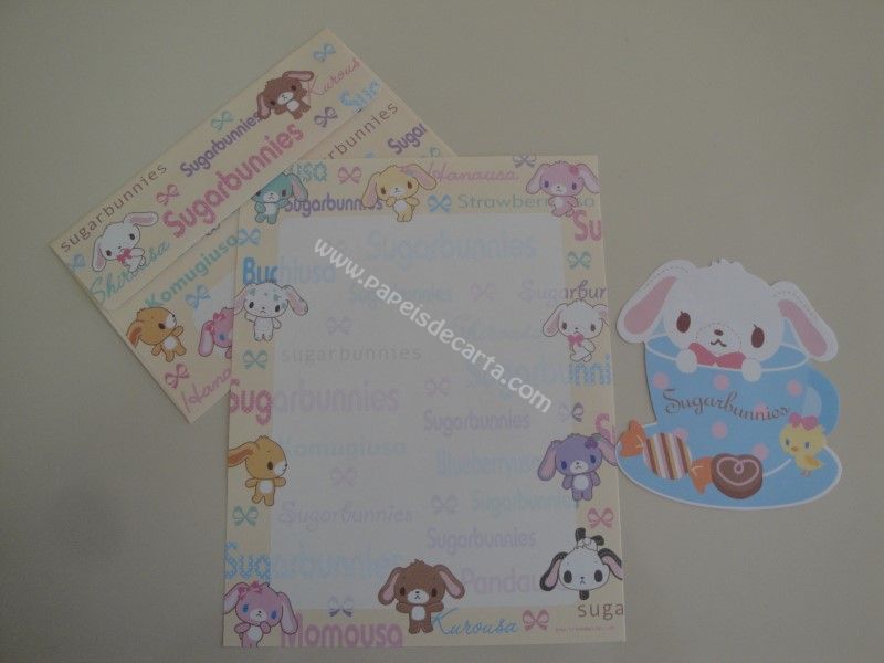 Conjunto importado de papel de carta, com 1 folha, 1 envelope e 1 notinha do Sugarbunnies, da Sanrio.