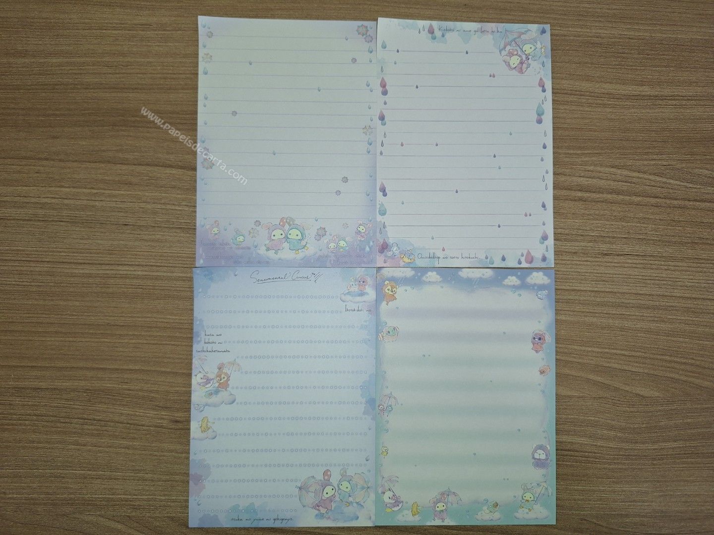 Lote de papel de carta importado, do Sentimental Circus, da San-X, com 4 folhas diferentes, tamanho pequeno, Larg: 10,5cm X alt 15cm.