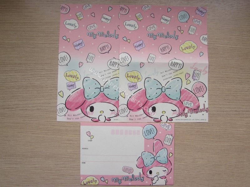 Conjunto importado, de papel de carta da My Melody, com 2 folhas iguais e 1 envelope, da Sanrio.