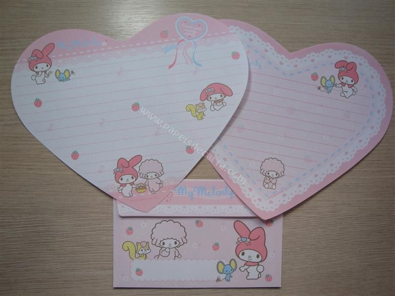 Conjunto de papel de carta My Melody com 2 papéis diferentes em forma de coração e 1 envelope.