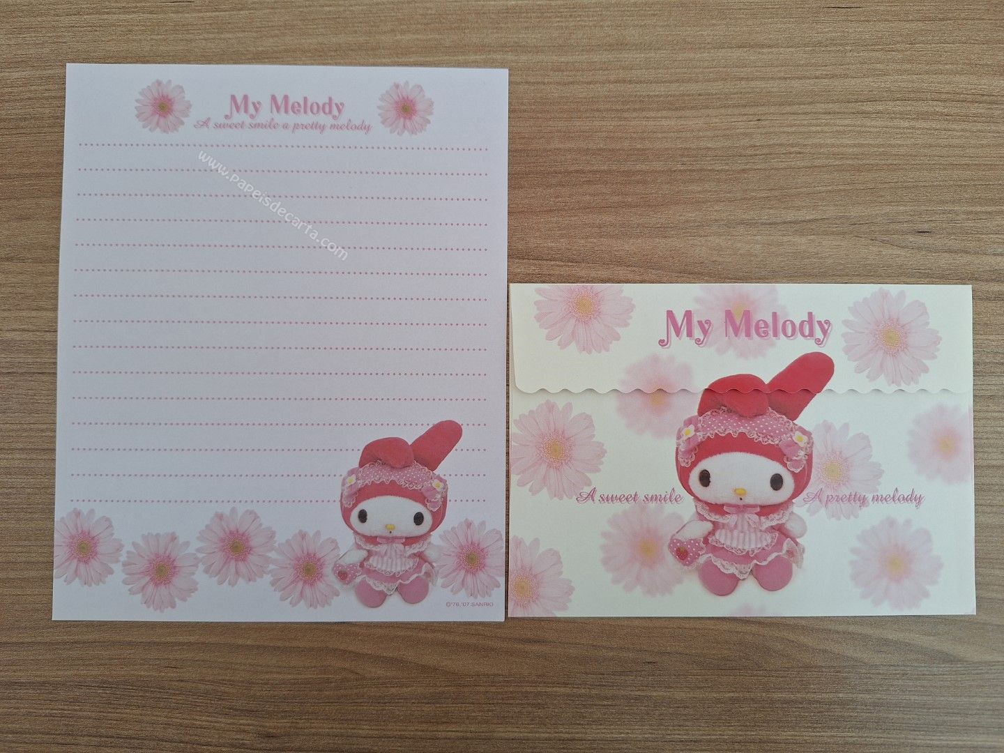 Papel de carta importado da My Melody com 1 folha e 1 envelope.