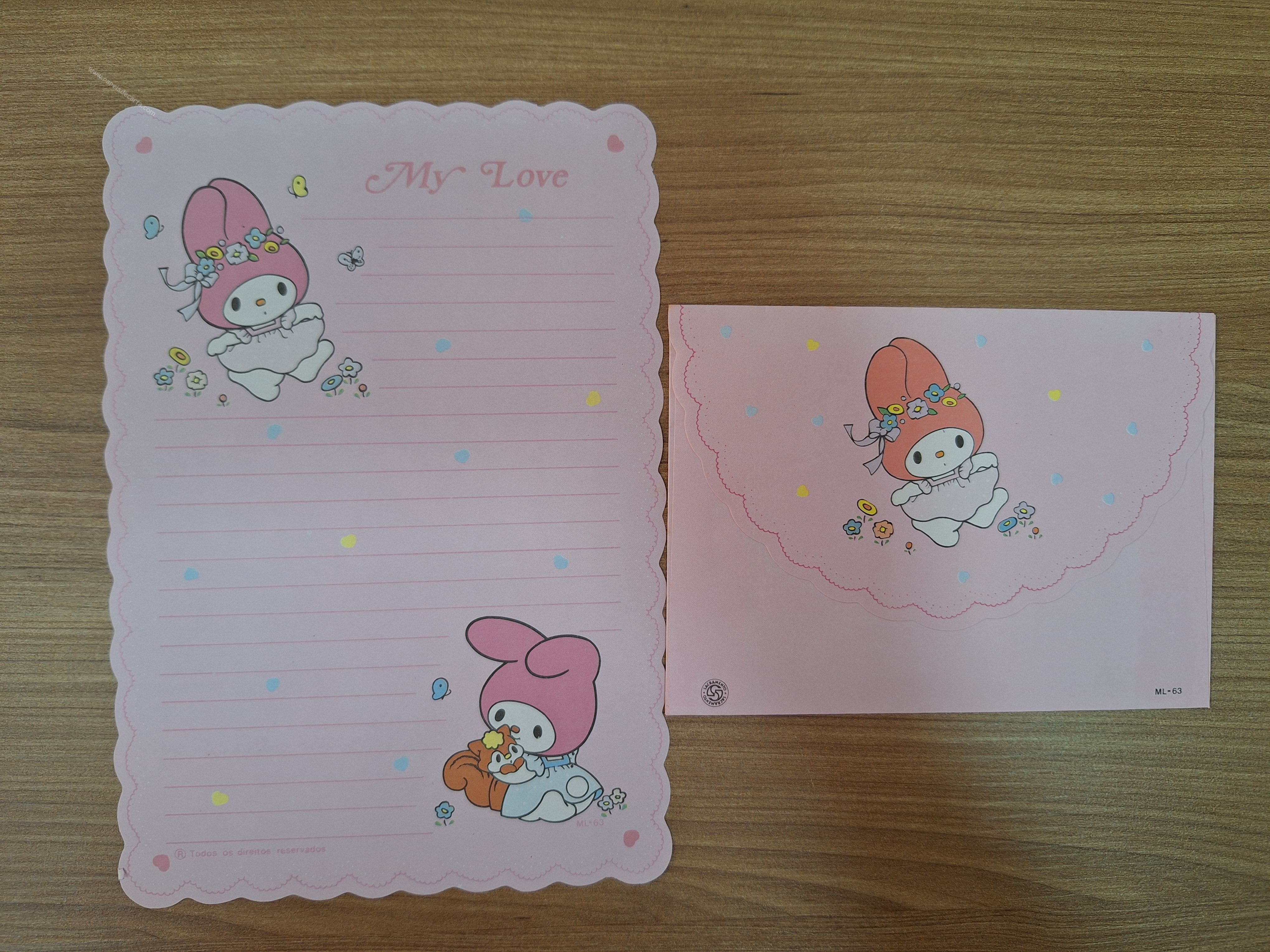 Papel de carta antigo da My Melody com 1 folha e 1 envelope.