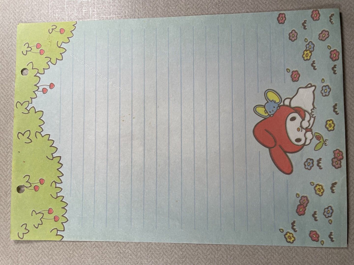 Papel de carta antigo da My Melody. Tamanho médio. ** O PAPEL TEM 2 FUROS DE FURADOR NA PARTE DE CIMA. OBSERVAR FOTO. **