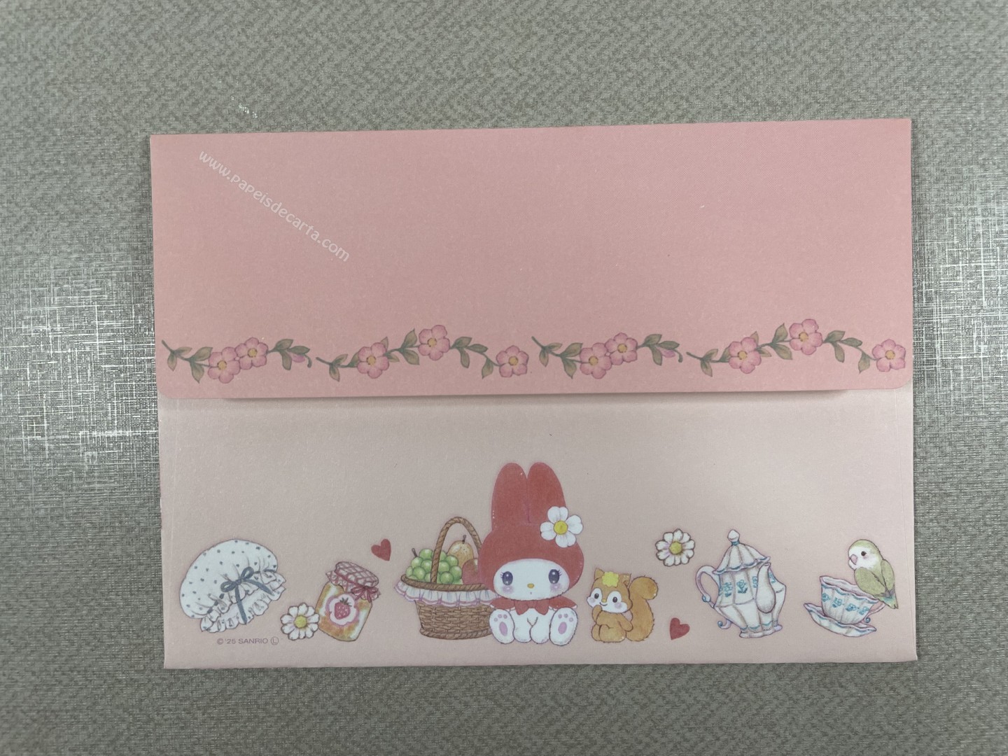 Conjunto de Papel de carta importado da My Melody com 2 folhas e 1 envelope. Tamanho médio. Possui detalhes em dourado.