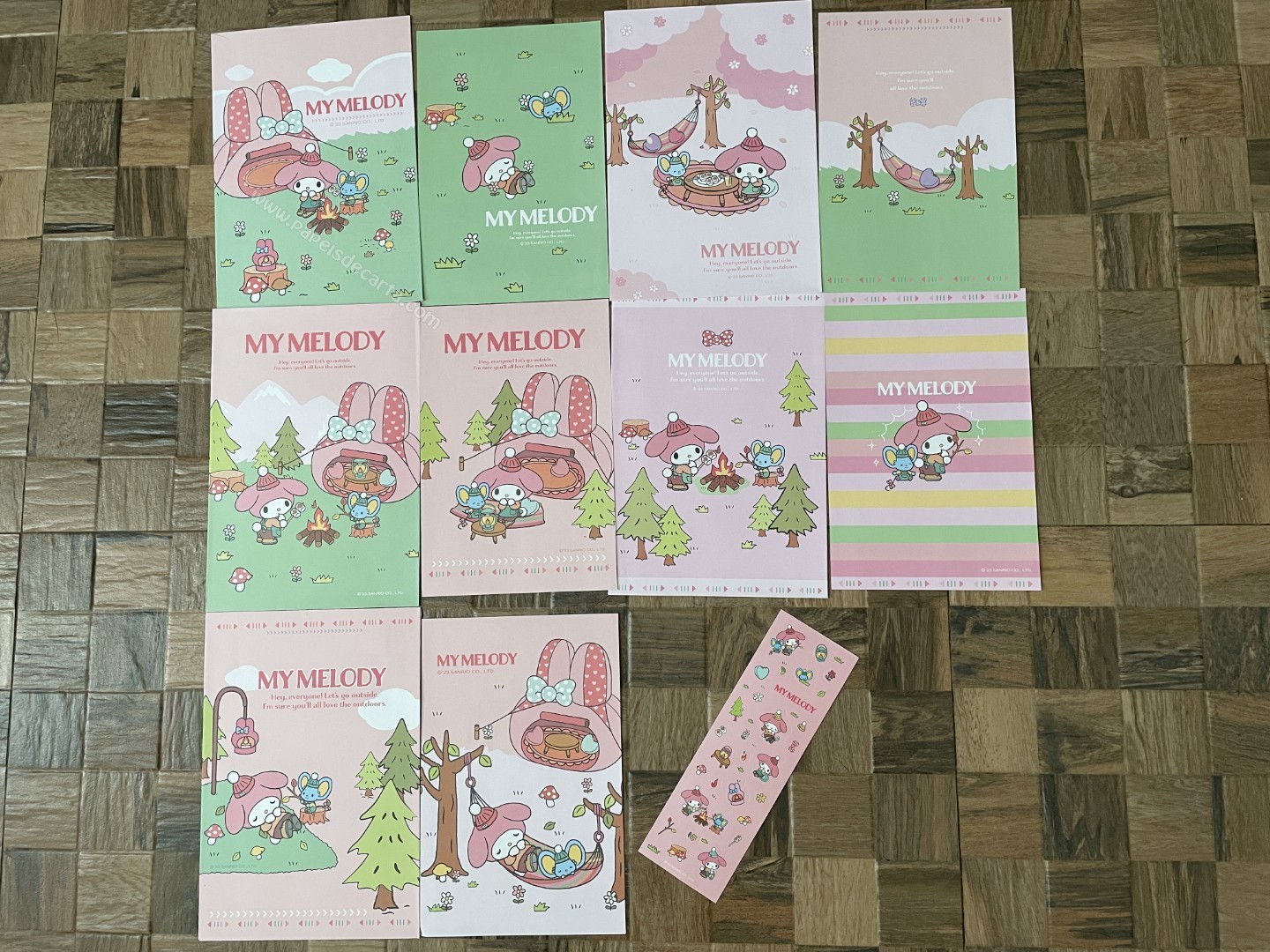 Lote de papel de carta importado da My Melody - Sanrio, com 5 conjuntos diferentes com 1 folha e 1 envelope cada + 1 cartela de adesivos. Tamanho da folha: 12,5 cm (larg) X 19 cm (alt). Tamanho do envelope: 13,5 cm (larg) x 20cm (alt). Folha e envelope tem desenho frente e verso.