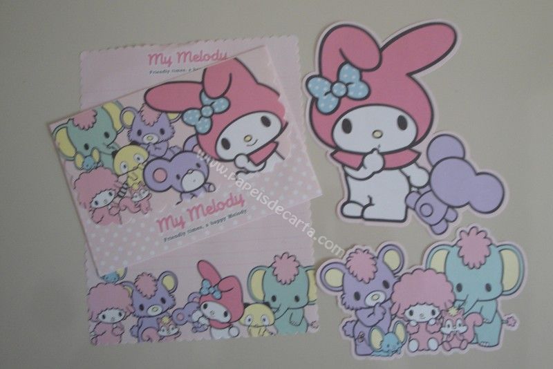 Conjunto importado, de papel de carta com 1 folha, 2 notinhas diferentes e 1 envelope da My Melody.