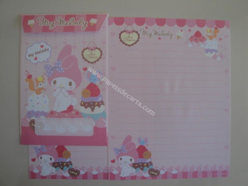 Conjunto importado, de papel de carta com 2 folhas iguais e 1 envelope da My Melody.