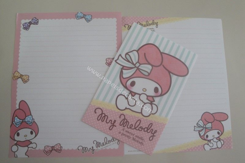 Conjunto de papel de carta importado, com 2 folhas diferentes e 1 envelope da My Melody, da Sanrio.