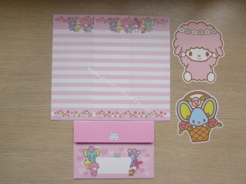 Conjunto importado, de papel de carta da My Melody, contendo 2 folhas iguais, 2 notinhas diferentes e 1 envelope, da Sanrio.
